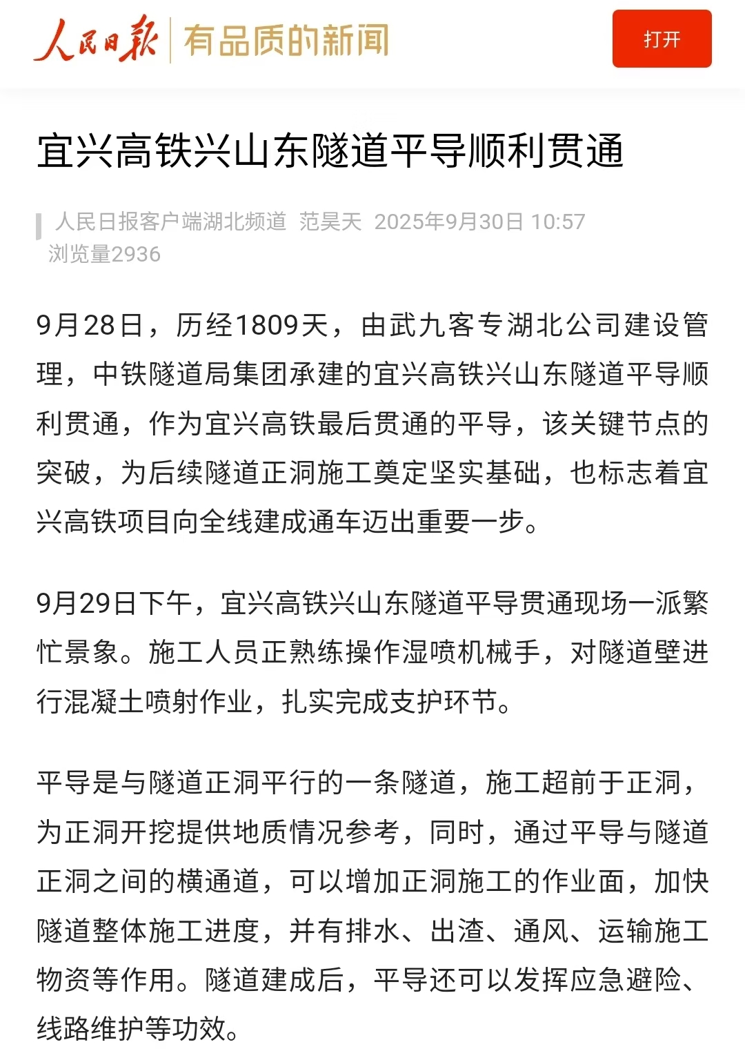 【人民日报】宜兴高铁兴山东隧道平导顺利贯通