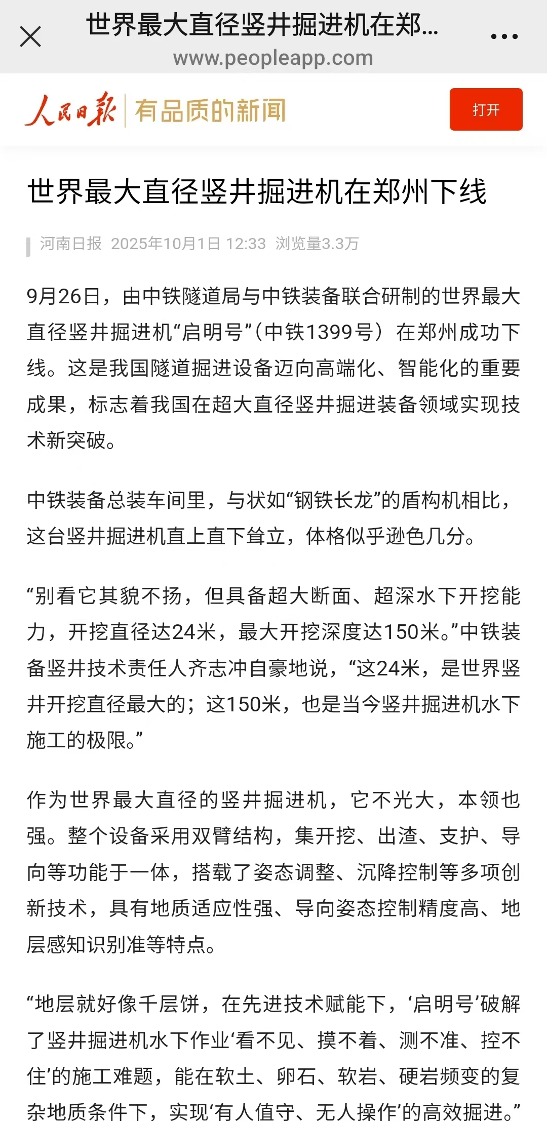 【人民日报】世界最大直径竖井掘进机在郑州下线