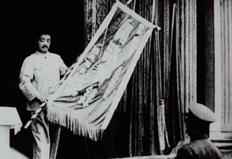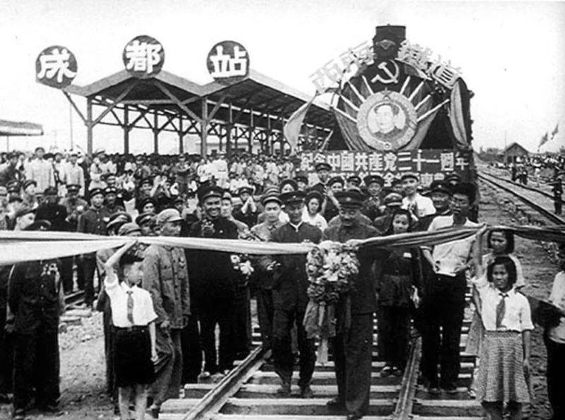 图为贺龙在成都站为成渝铁路首发列车剪彩
