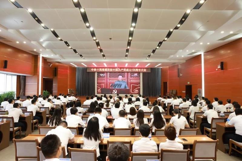 ▲中铁十局本部组织员工集中收看庆祝大会盛况