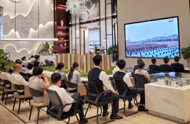 ▲中铁置业北京诺德逸府项目售楼处员工集中收看大会直播